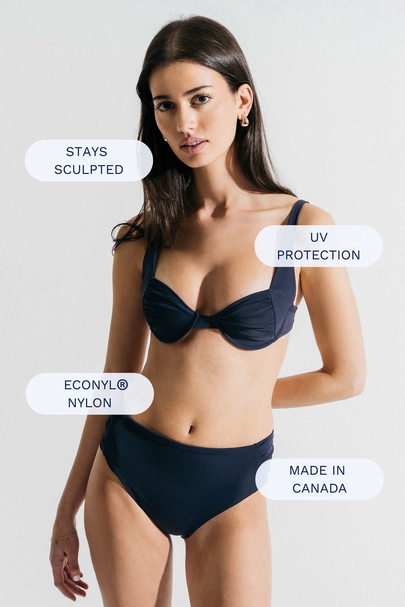 Model is wearing size XS top and S bottom. Please review our size guide if you are unsure!